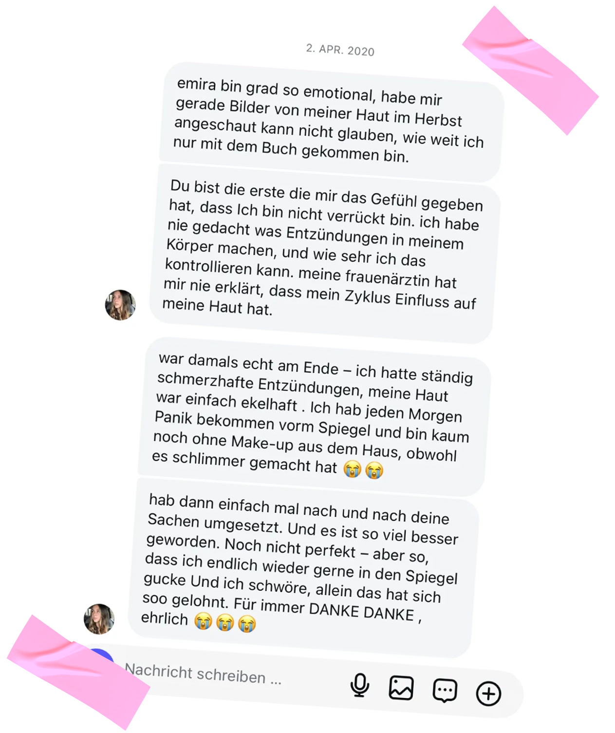 Lies es einfach. Ich hab auch erstmal nur gelesen – aber beim zweiten Mal hat plötzlich alles Sinn gemacht. Ich hab nicht sofort perfekte Haut bekommen, und es hat lange gedauert, bis ich wirklich etwas verändert habe. Aber ich habe endlich verstanden, warum mir jahrelang nichts geholfen hat – und als ich dann Stück für Stück die Tipps umgesetzt habe, hat sich nicht nur meine Haut verändert, sondern mein ganzes Mindset.